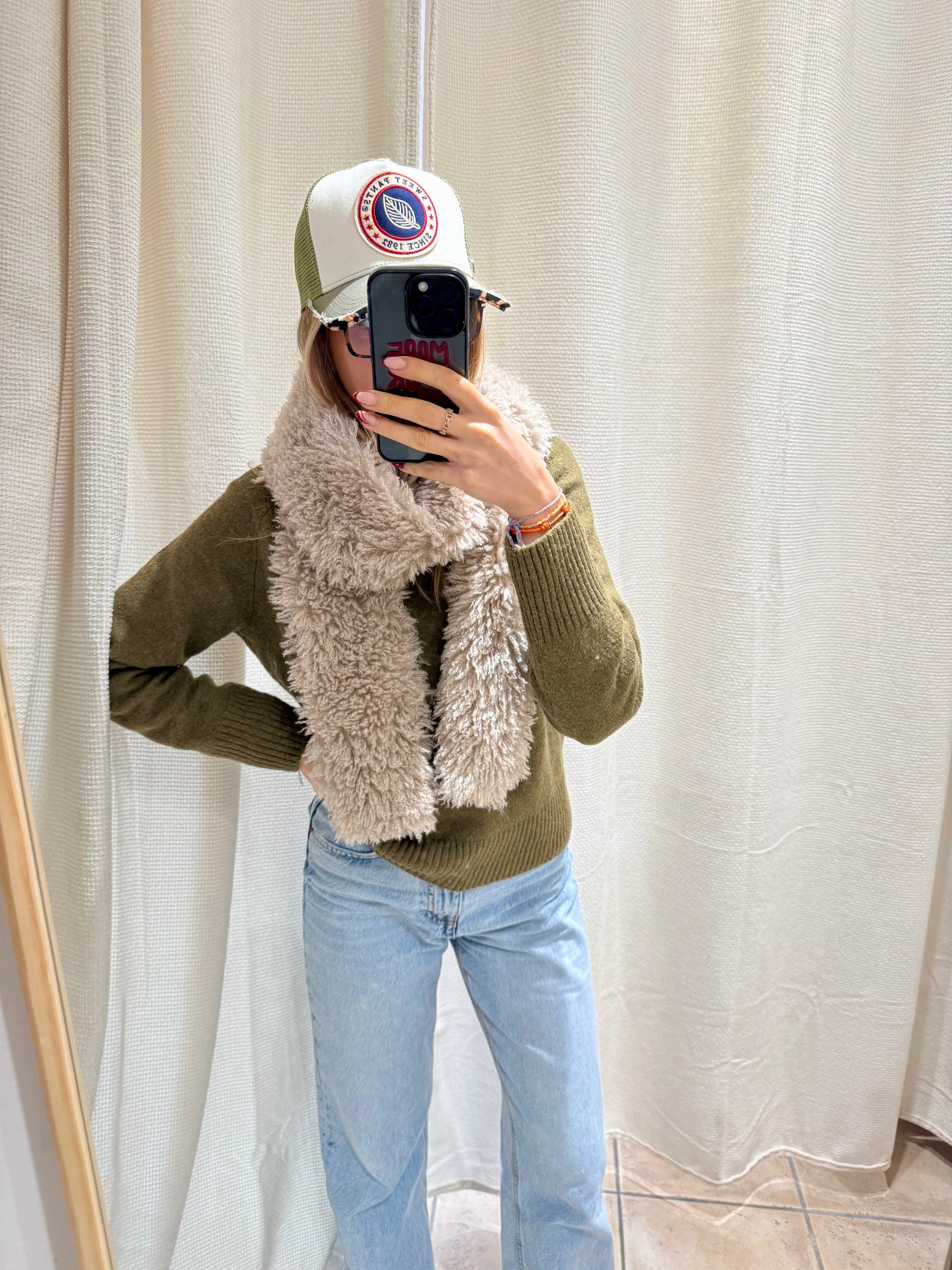 Courte et en moumoute beige, elle apporte chaleur et style à vos tenues hivernales. Confortable et douillette.